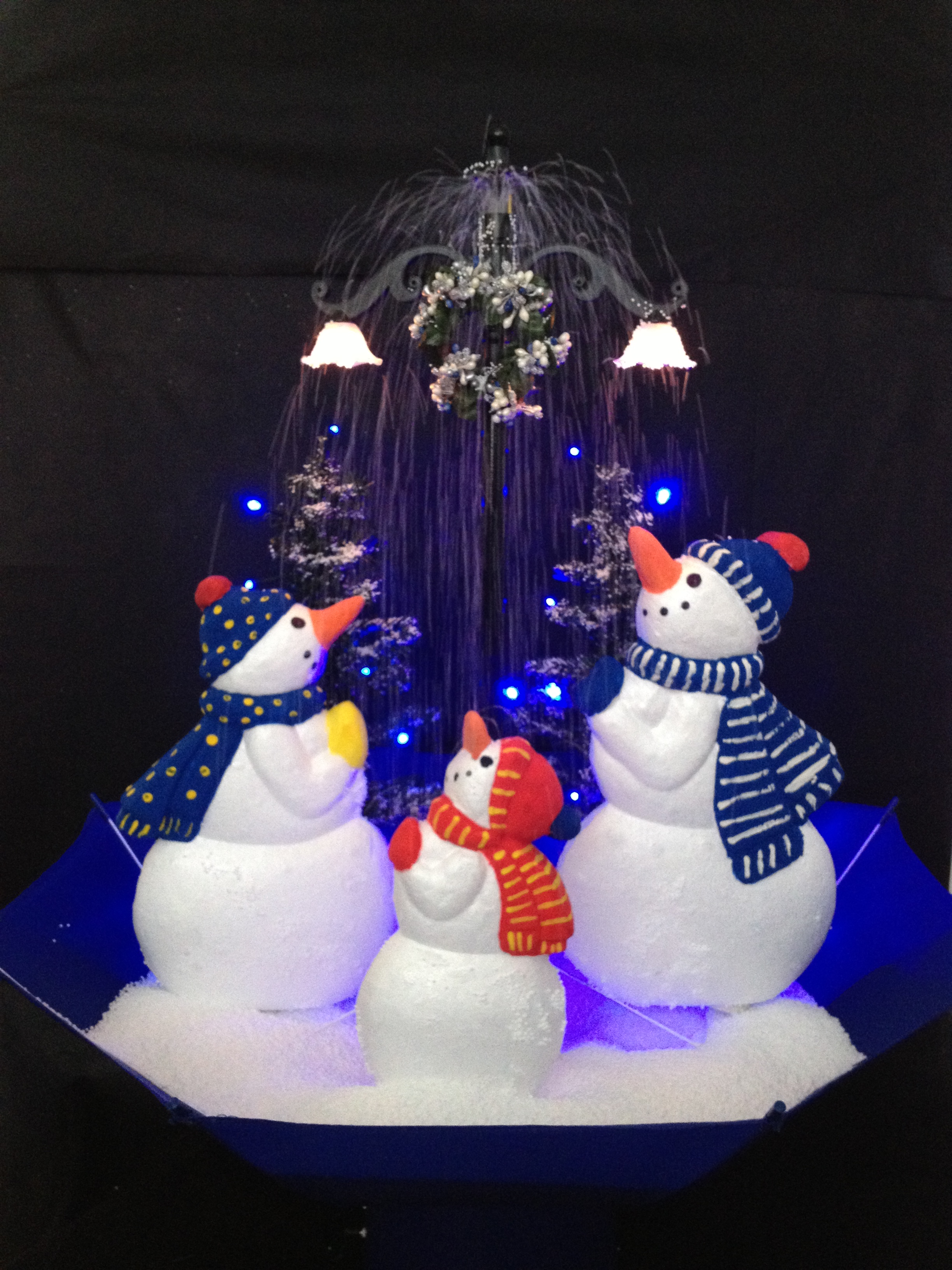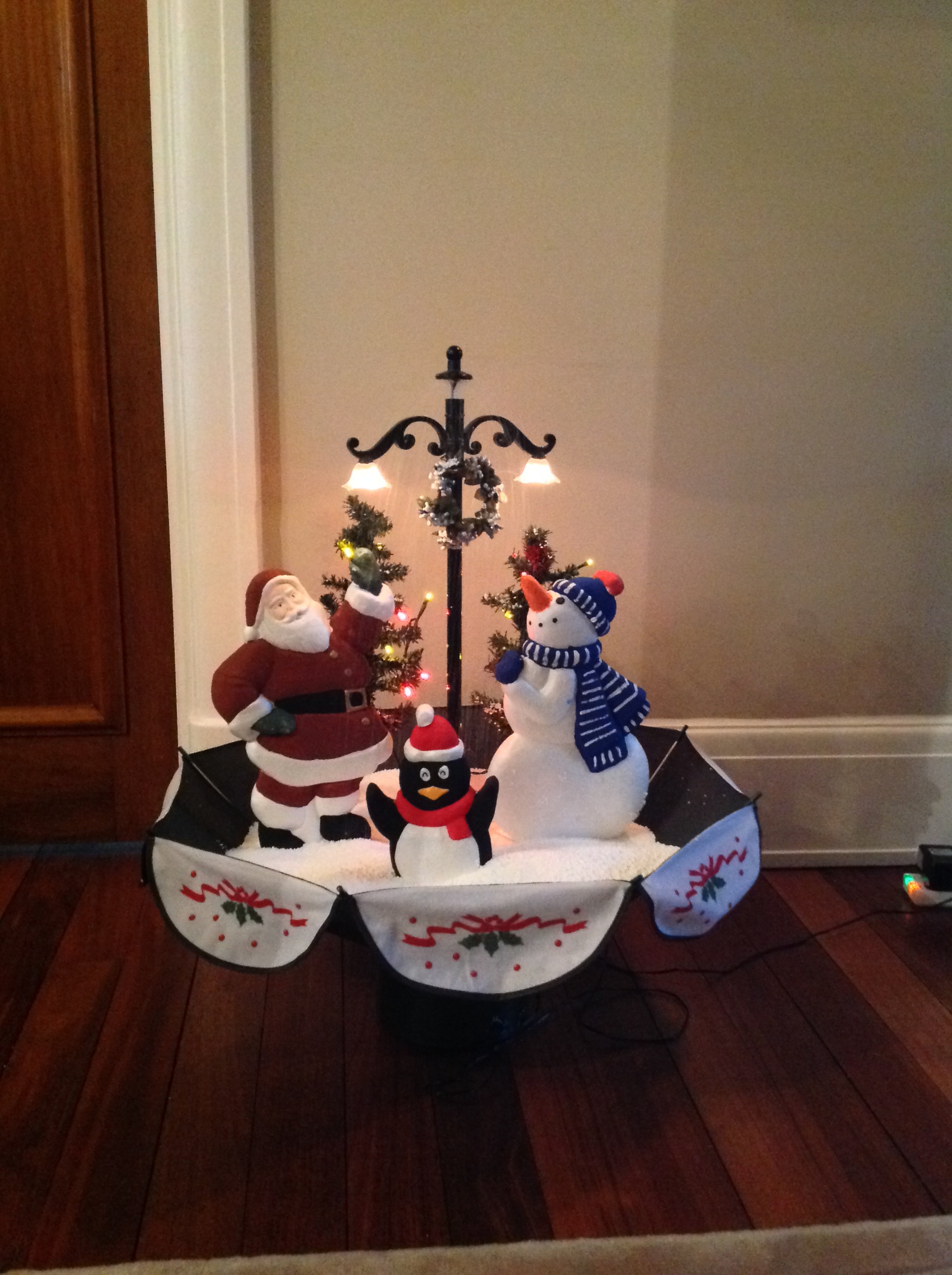 Snowmen, Penguins or Santa, with 2 mini Christmas trees under a lamp that