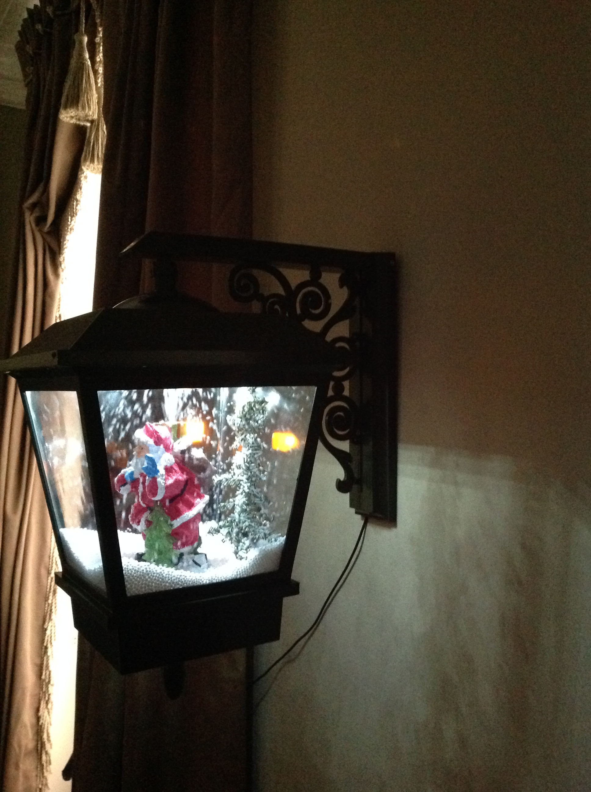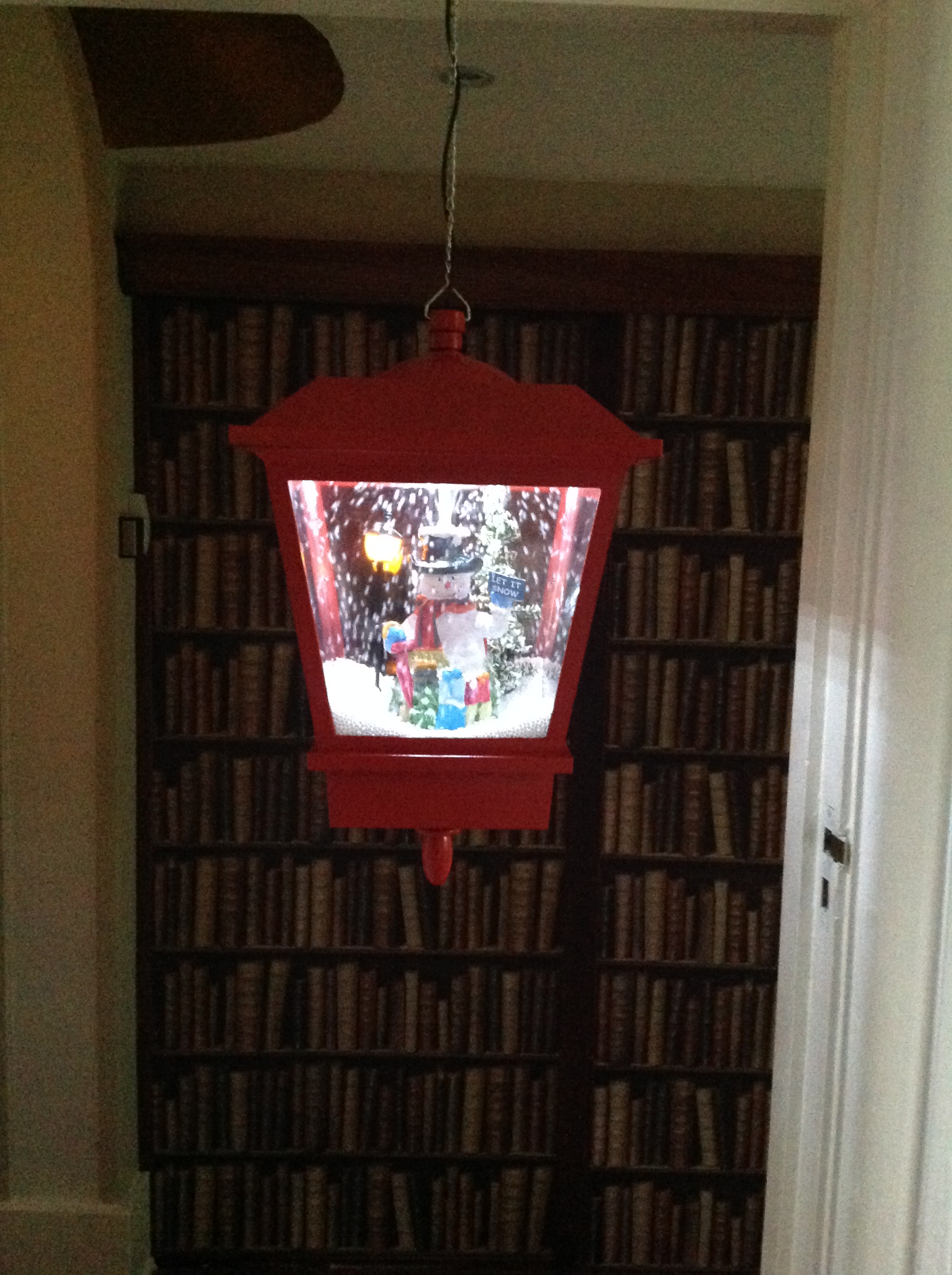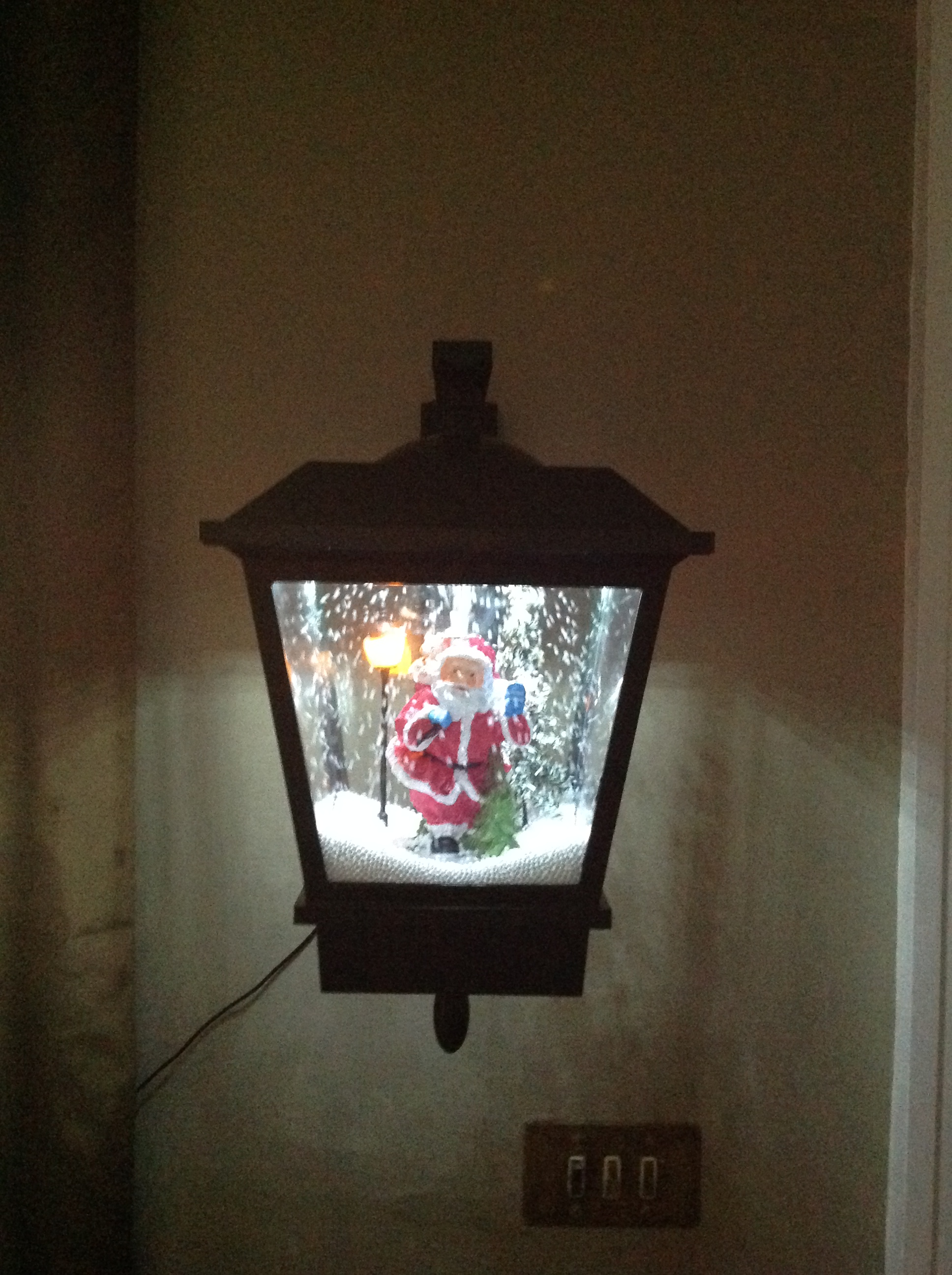 The snow is contained within the lantern which is illuminated by LED lights inside.