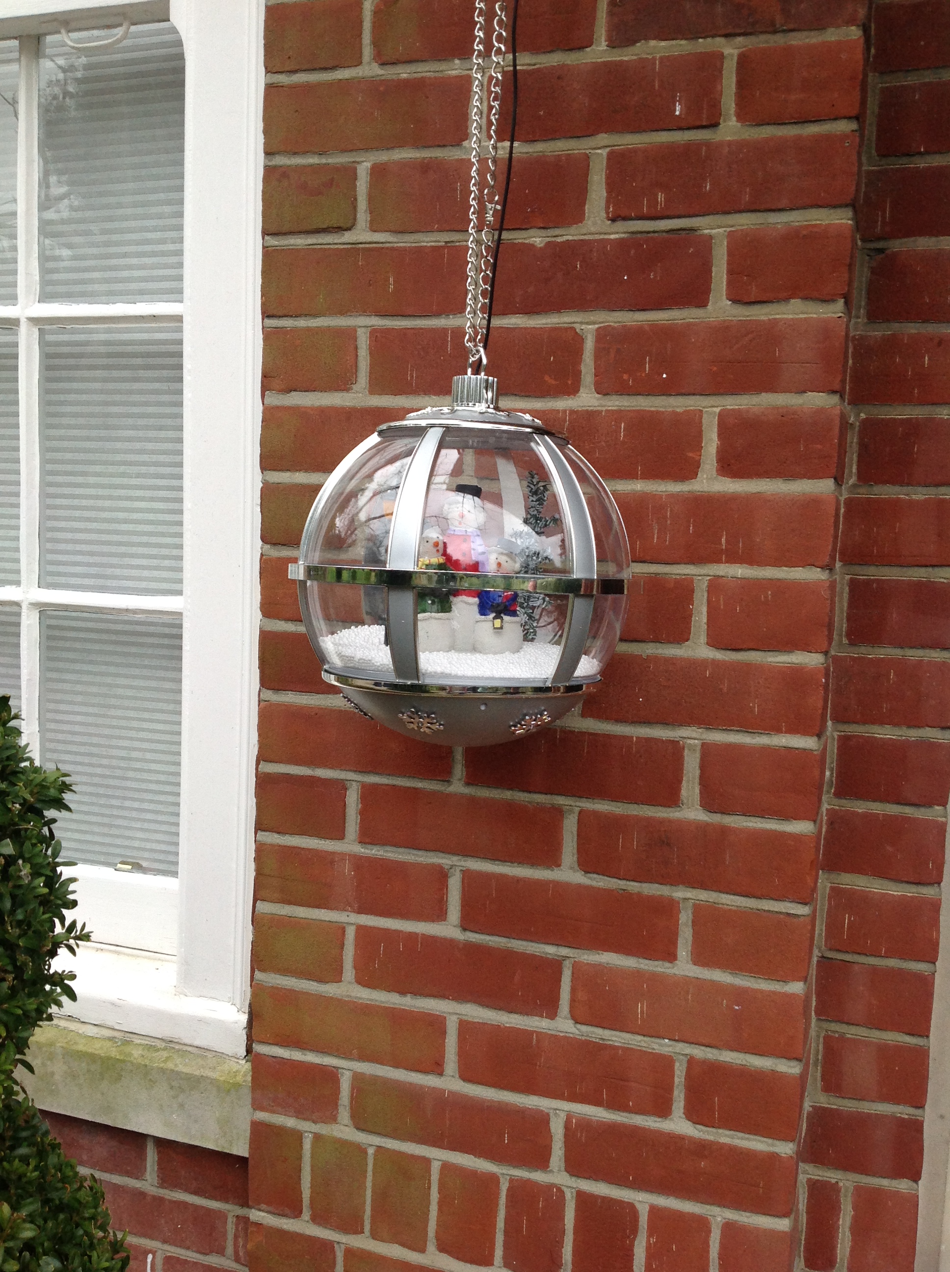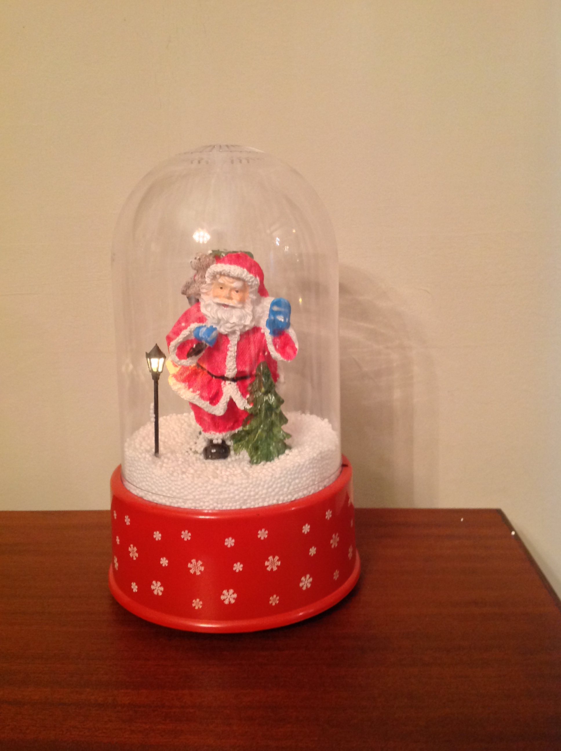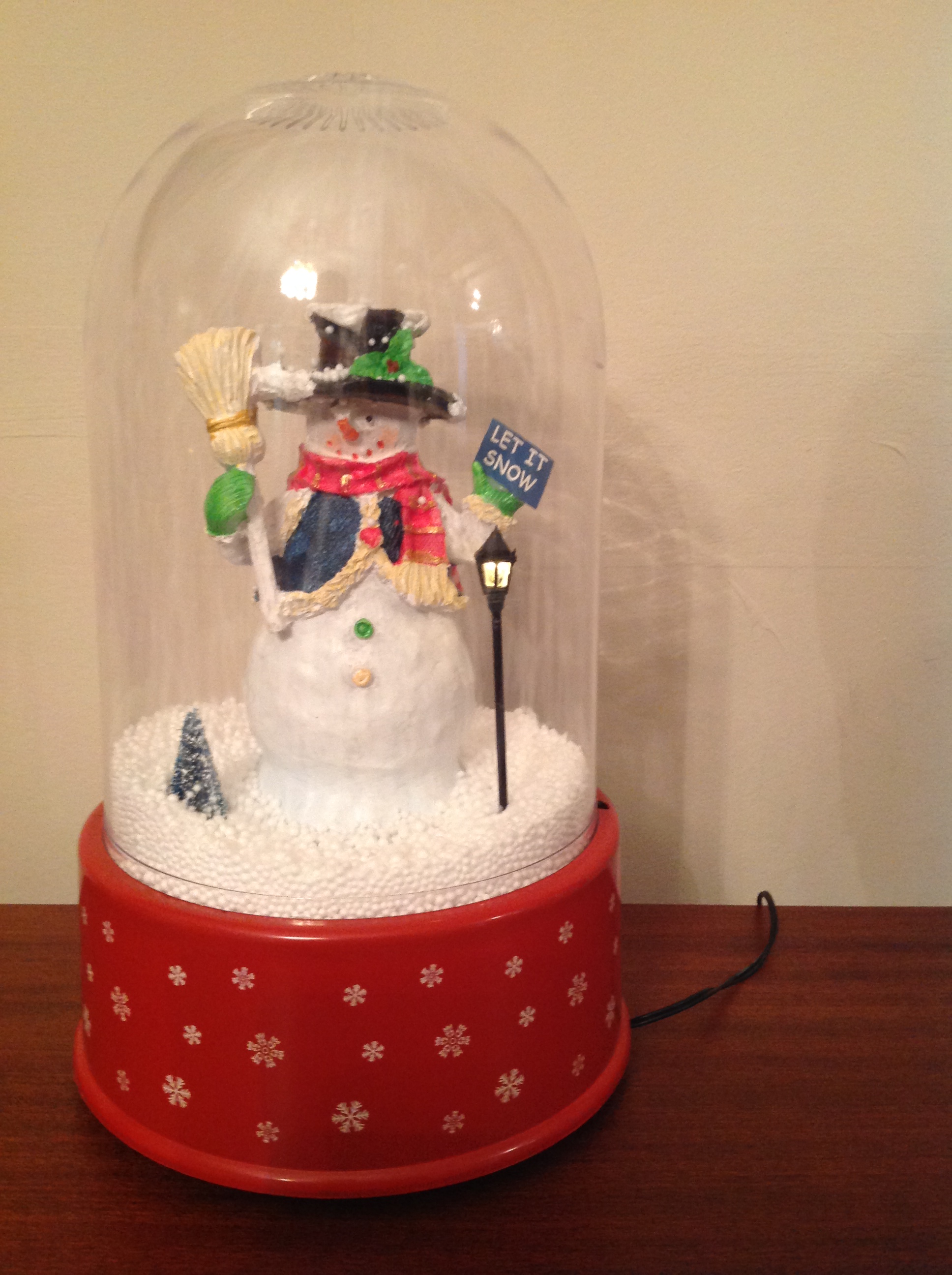 The snow is contained within the globe which is illuminated by LED lights inside with additional LED lights underneath the globe.